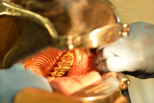 Auscultation of the cardiovascular system will be carried out during preliminary examination and examination under strenuous exercise. In cases of in- or expiratory noises during exercise endoscopy will be advised to examine the larynx. Dental health will be checked to detect any kind of dental abnormalities or inflammations. Eye examination includes external inspection as well as the use of an ophthalmoscope for the ocular fundus.