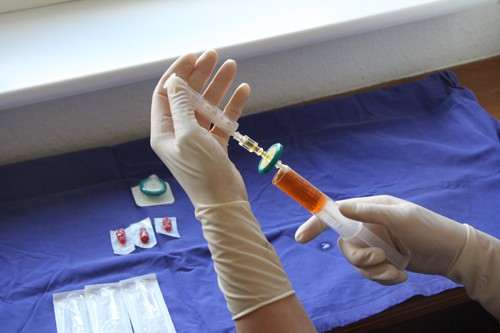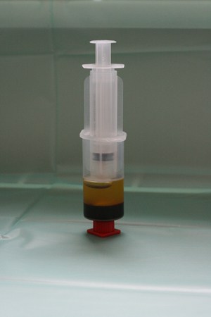 PRP (platelet rich plasma): Platelet rich plasma is defined as a volume of the plasma fraction of autologous blood having a platelet concentration above baseline. Platelets contain an abundance of growth factors and cytokines that are pivotal in soft tissue healing so that they are mainly used in case of tendon and suspensory ligament injuries. For the production of PRP we use the Arthrex ACP-Set so that we are able to treat the patient 30 minutes after blood withdrawal.
